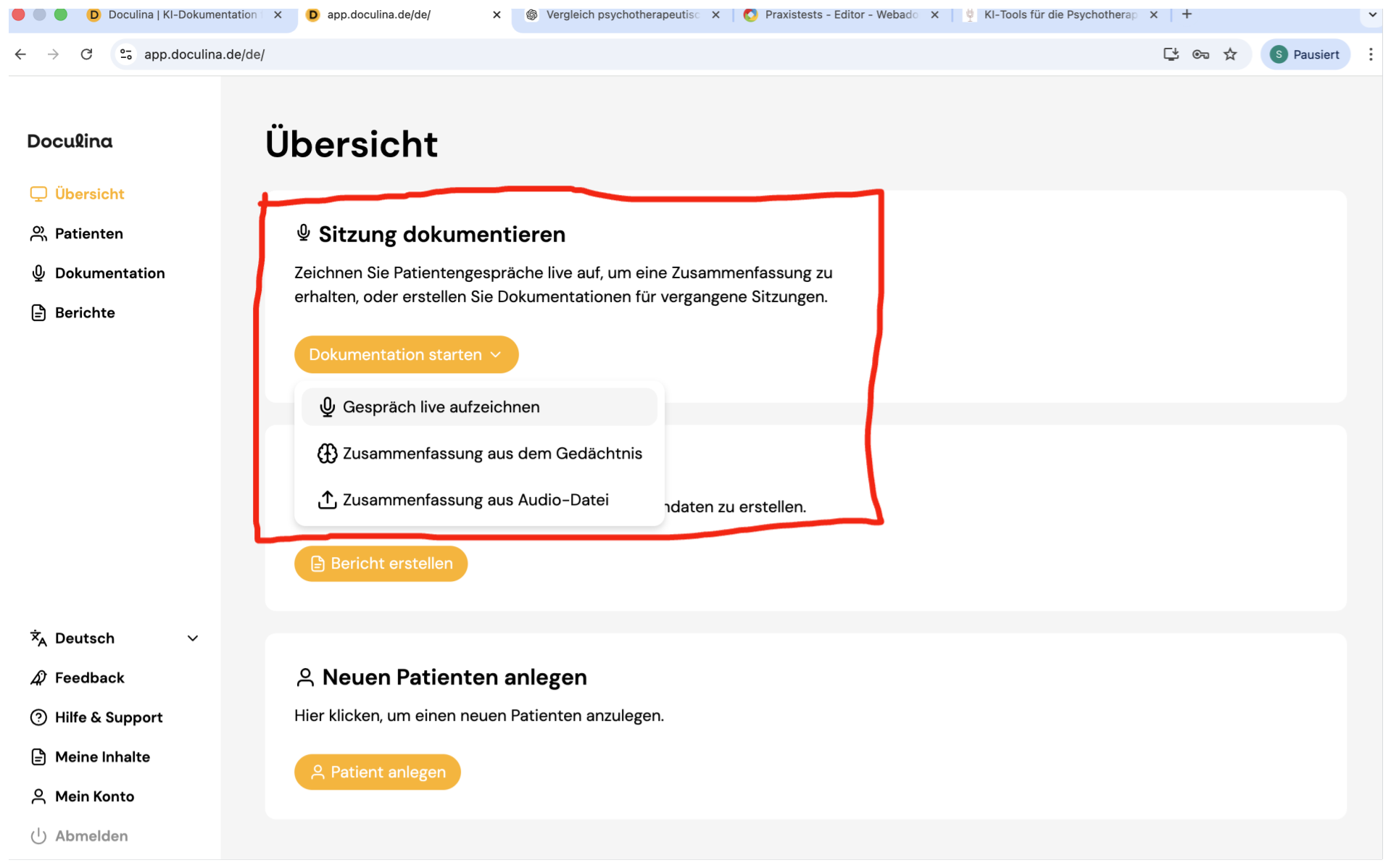 Doculina bietet alle üblichen Funktionalitäten: Audioaufnahme, Zusammenfassung und Berichtserstellung (inkl. der Möglichkeit, Notizen einzuspeisen, Dokumente hochzuladen usw.). Im Unterschied zu anderen Tools gibt es in Doculina auch die Möglichkeit, Patient:innen anzulegen, um später auf Dokumentationen, Berichte und Verlaufsaspekte zurückgreifen zu können.