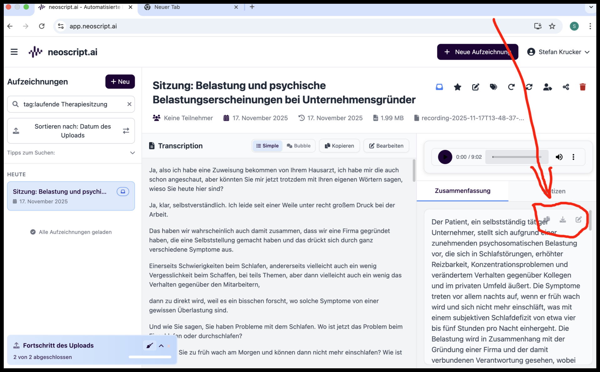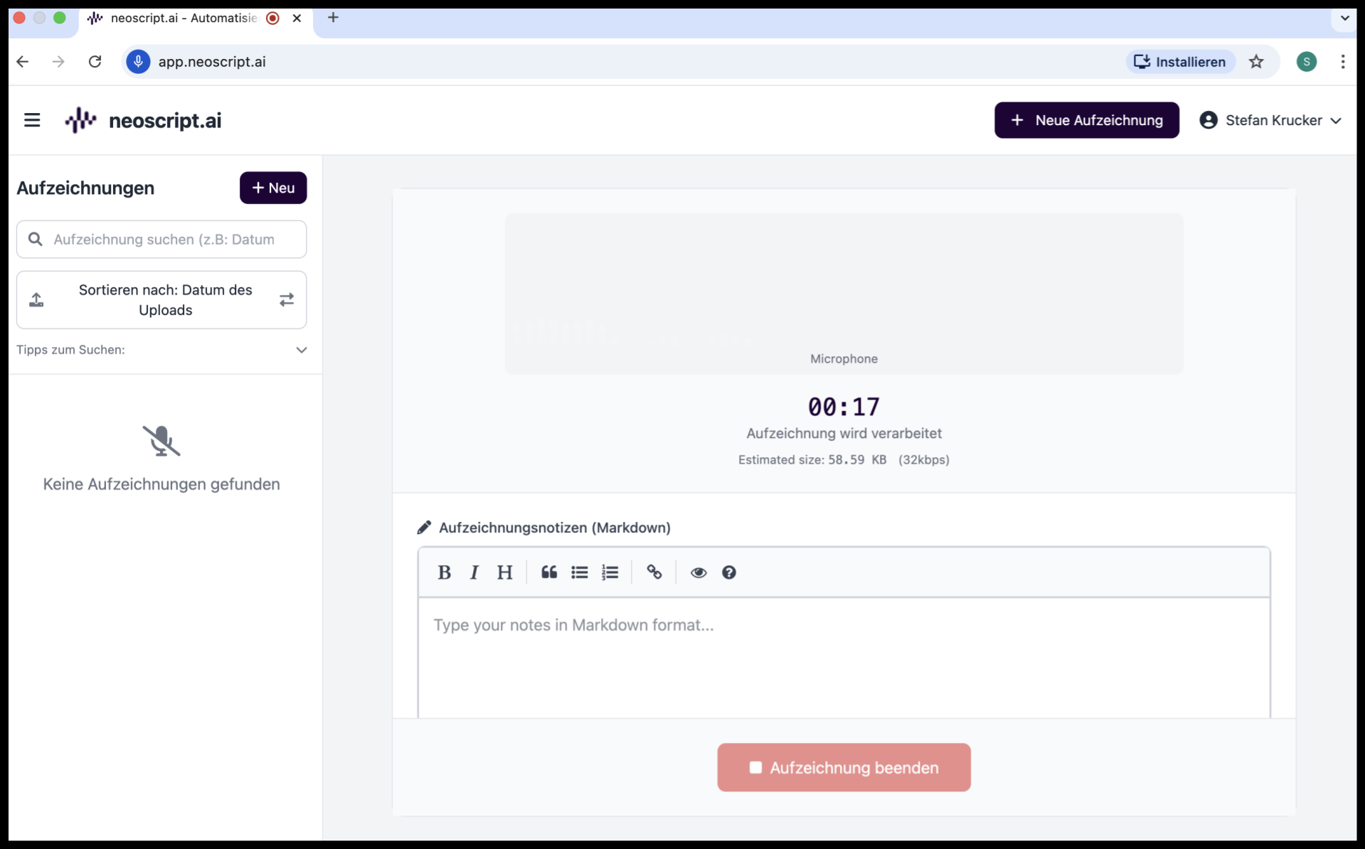 Der Gründer von neoscript, Galip Özdemir, erklärt mir in einem 30-minütigen Videocall sein Produkt. Galip ist übrigens selbst Psychologe. Nach dem Call erhalte ich die Zugangsdaten und treffe auf eine aufgeräumte Benutzeroberfläche. Ich kann direkt mit der Audio-Aufzeichnung loslegen und auf Wunsch Notizen einfügen.
